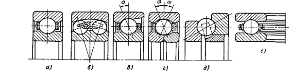 Выбирая тип подшипников, целесообразно прежде всего рассмотреть возможность применения радиальных однорядных шарикоподшипников (подшипник исп. 0000 на рис. 3.1), как наиболее массовых, простых и дешевых. Применение других типов подшипников всегда должно быть строго обосновано.
