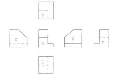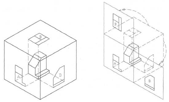 Американская система плоскостей проекций основана на принципе стеклянного куба, внутри которого помещена деталь. Изображение проецируется на видимые наблюдателю передние грани куба (рис. 1), после чего грани куба разворачиваются на плоскость чертежа.
