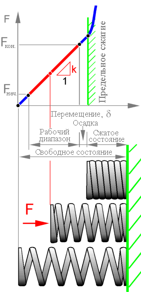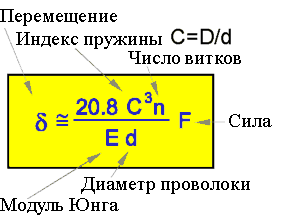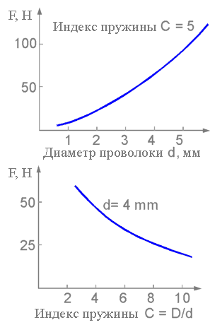 Проволочная винтовая пружина описывается диаметром проволоки d, средним диаметром витка пружины D, общим количеством витков nt и индексом пружины C. Индекс пружины C равен отношению среднего диаметра витка к диаметру проволоки. Низкий индекс соответствует более высокой кривизне намотки проволоки, большей неоднородности распределения напряжений и самому высокому остаточному напряжению. Индекс пружины обычно имеет пределы между 5 и 10 для плотно навитых винтовых пружин из круглой проволоки. Пружины сжатия с C > 10 могут легко терять первоначальную форму. Они неустойчивы без специальной поддержки.
